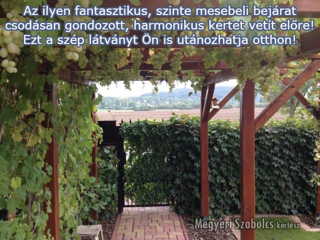 A fenti képen látható rendkívül hangulatos, romantikus kaput a kertbarát tulajdonos 3 - 4 éve kezdte el fejleszteni, akkor kezdett el tapadókorongos vadszőlőt futtatni a kapura és a kerítésre, valamint csemegeszőlőt a kapuhoz vezető pergolára.
