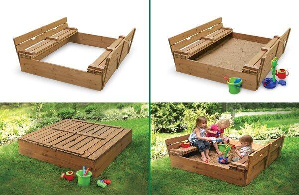 A legegyszerűbb megoldás, hiszen néhány deszkából, akár újrahasznosított raklapból is elkészíthető. Fontos, hogy a fát mindenképp kezeljük, hogy időjárás álló legyen. Előnye, hogy ha a gyerekek kinövik, akkor könnyen elbontható, ráadásul bekerülési költsége is megfizethető. Akár pad is kialakítható a szegélyében, de ne feledkezzünk meg a tetejéről sem, mindig takarjuk le, ha vége játéknak, így kellemetlen meglepetésektől kímélhetjük meg magunkat.