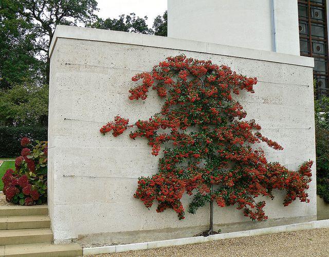 A tűztövis egy sokszor közterületeken is látott növény, melynél előbb gondolnánk arra, hogy sűrűs sövényként megállja a helyét, mintsem falra futtatnák. Pedig kezdeti támaszték mellett tökéletes választás a falak befedésére, hiszen a korosodó tövek már megtartják a saját súlyokat. Nagyon nagy előnye, hogy metszéssel könnyen alakítható, így különböző geometrikus formák is kialakíthatók belőle. Egyik kedvelt ilyen kialakítási formája, amikor apáca rácsos formára nevelik. forrás:
