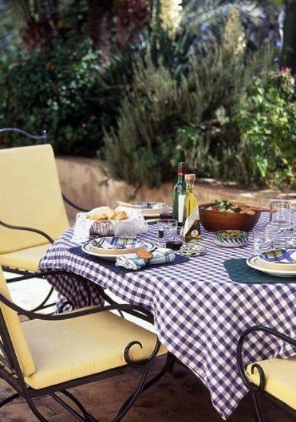 Ha a fentebb említett kertigarnitúra már megvan, tovább fokozhatjuk a hatást mediterrán dekorációval. A kék kockás abrosz kihagyhatatlan, és az asztalon hanyagul elhelyezett kék alapszínű edények, vázák erősítik a hatást. Ha van hely a teraszon, a merészebbek még egy régi, kopottas tálalószekrényt is rendszeresíthetnek, természetesen kék-fehér színre festve.
