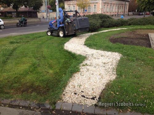 Szükséges egybefüggő térkövezett területek létrehozása vagy csupán egy szélesebb gyalogútra lenne szükség, melyet fák szegélyeznek. Ilyen és hasonló kérdések sorával találkozik az, aki a tervezésre adja a fejét, de ez nem csak a közparkok, bármilyen kerti terve is vonatkozik. Az alábbi képen egy kevésbé fenntartható példát hoztam, melyen egy rosszul kivitelezett kavicsjárda látható. Fenntartása időigényes, nincs megfelelően határolva, nincs kiegyenlítve a terület, így használat során a kavicsok a szegélyező gyepre kerülnek lassan, de biztosan be fog gyomosodni. Tisztán- és gyommentesen tartása pedig sok időt igényel.