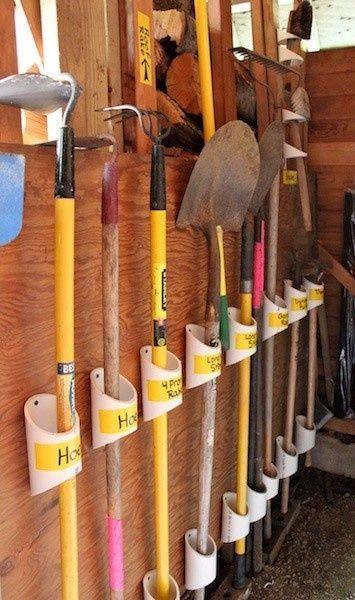 A nagyobb méretű, nyeles szerszámokat is tárolhatjuk a falon, ha megfelelő támasztékot biztosítunk, hiszen itt fontos, hogy ne dőljenek el, ne gabalyodjanak egymásba eszközeink. Erre jó megoldás lehet, ha PVC csőből készítünk nekik tartót, melyet a falra csavarozunk, olcsó és gyors megoldás, mely könnyen átláthatóvá teszi a tárolást.
