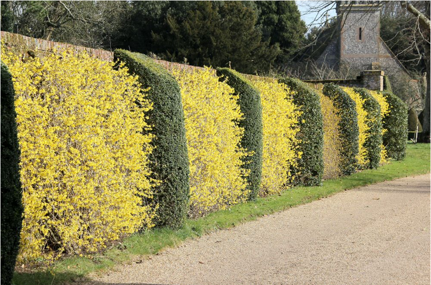 Kipróbálhatjuk a fenti képen látható megoldást, ahol buxus és aranyvessző (pl.: Forsythia 'Week End') váltakozik. Ha többféle növényt alkalmazunk együtt, akkor vegyük figyelembe, hogy nyírása, fenntartása fokozottabb figyelmet igényel, mert a két növény más habitusú, ezáltal lehet, hogy másképp kell metszeni és ápolni őket.
