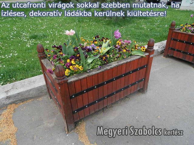 Lehet ízlésesen alkalmazni a konténeres beültetéseket! Az időjárásnak ellenálló stílusos faládában a színes virágok roppant látványosak, és egységes képet alkotnak, szemben a régimódi betonkonténere és színes virágok kellemetlen kontrasztjával.